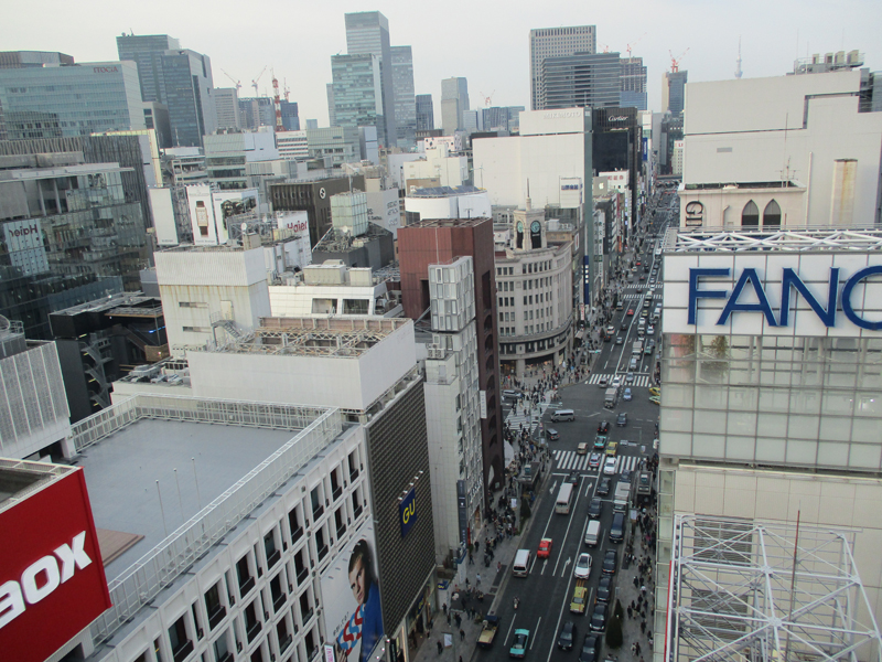 銀座のビルの屋上機器ばかり見えてあまり美しくない。きっと夜でしょうね、きれいになるのは。