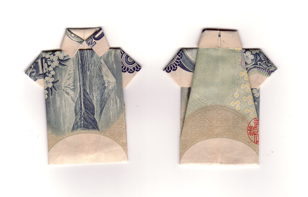 1000円札を折り曲げると、可愛い少女の服になる。一万円札、5千円札、2千円札、みんなやってみたが千円札が一番左右対...