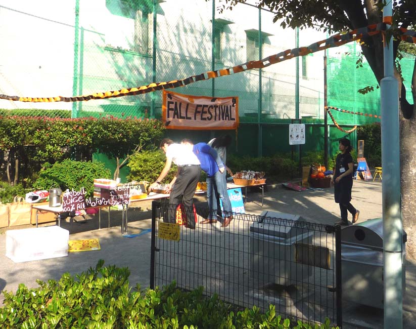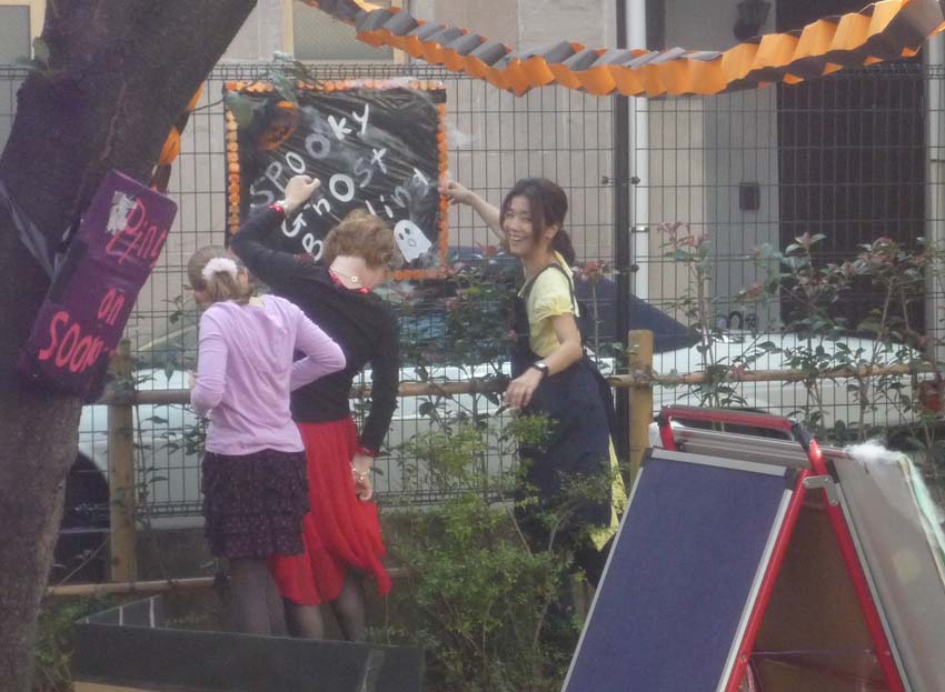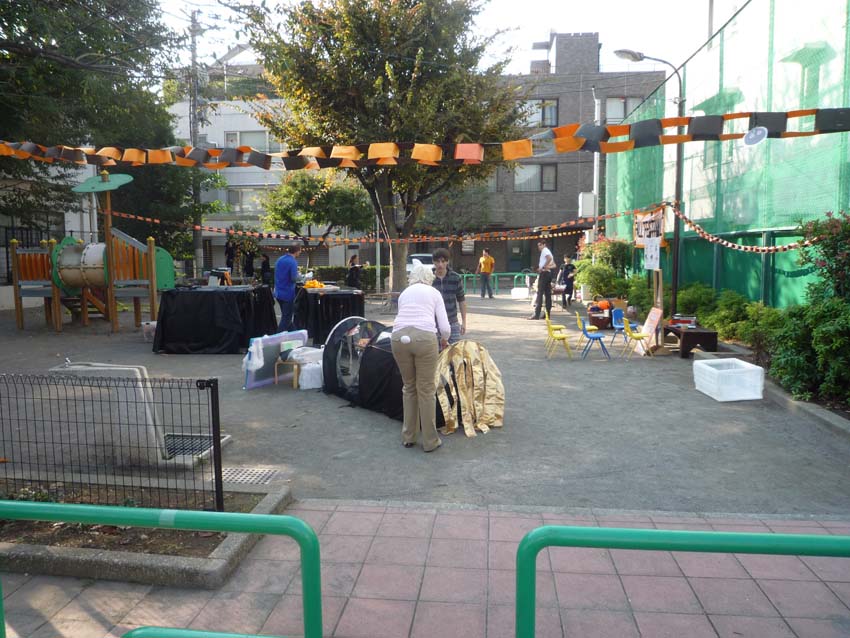 小さい公園(ここの鉄柵でボクは腕立て伏せをする)で、ハローウインのパーティの準備。
