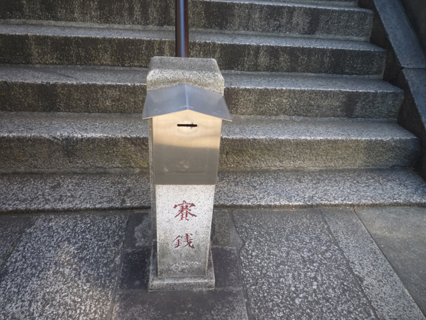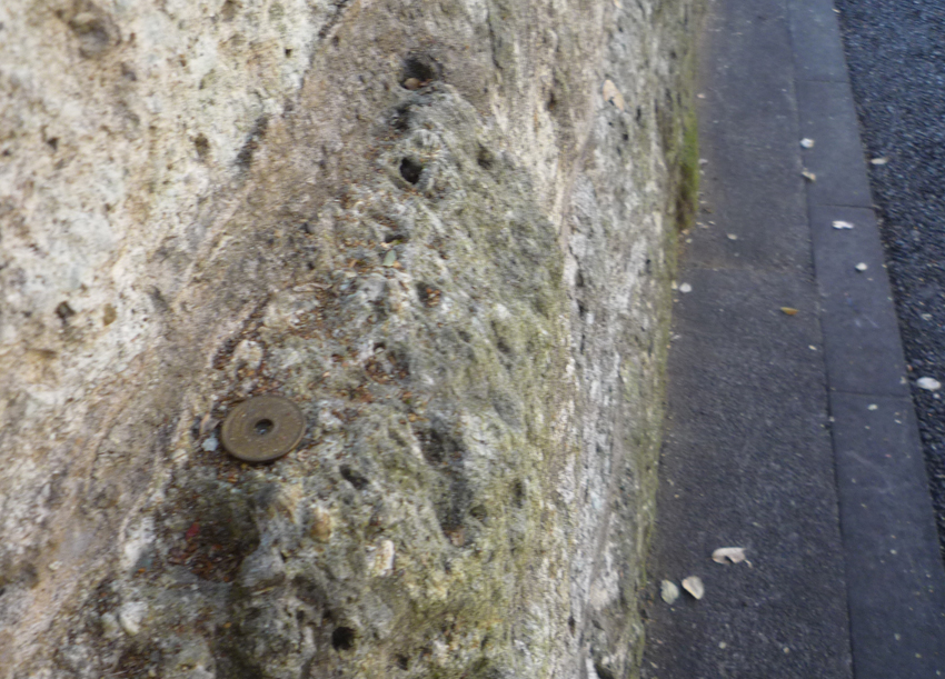 大谷石の崖の段差に、5円玉が、...