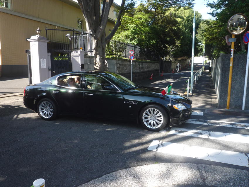 イタリア大使館の扉が開いた、国旗を立てたクルマが出てくる。出て来たクルマを見て、たまげたなあ。