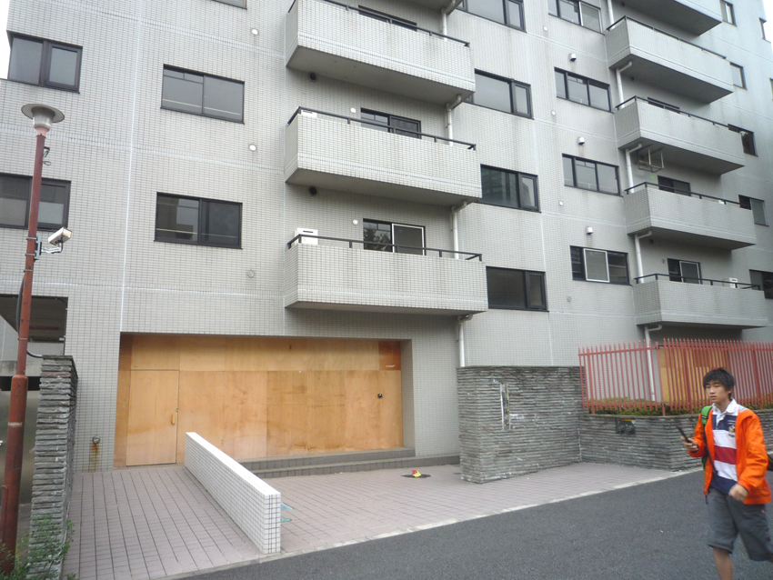 久しぶりに前を通ったら、あらら板が打ち付けられている。