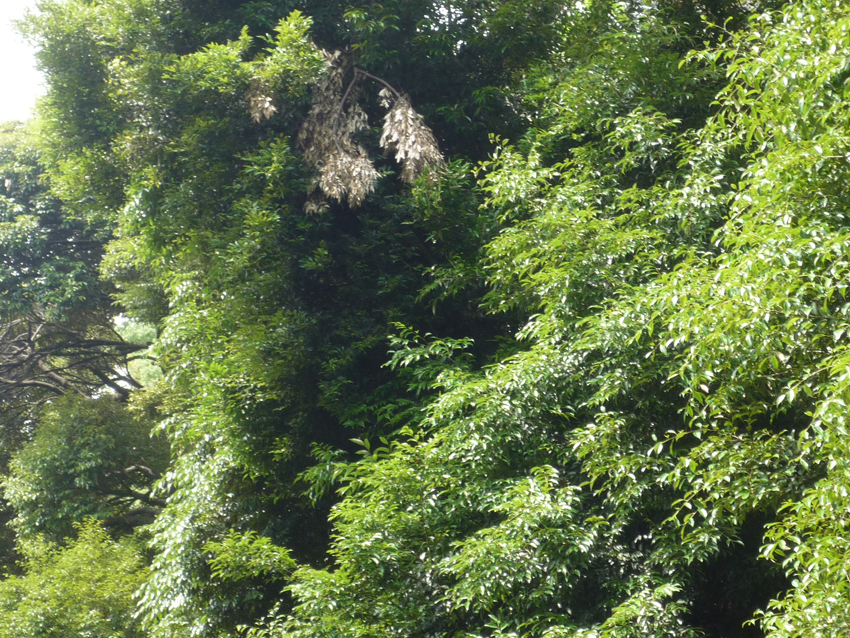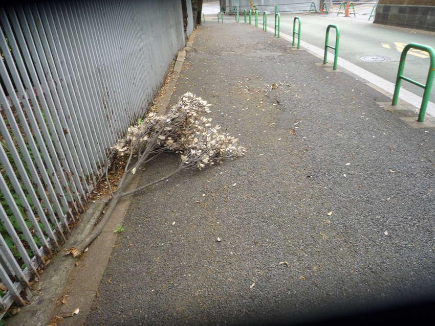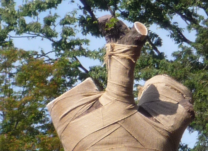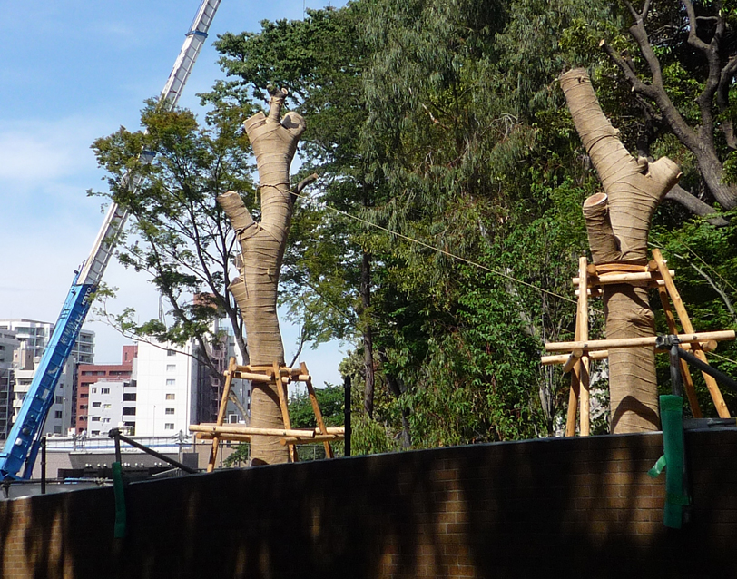 そこに包帯だらけの樹が数本。2mぐらい塀から内側へずらしたようだが、あまり...