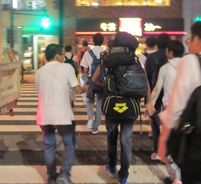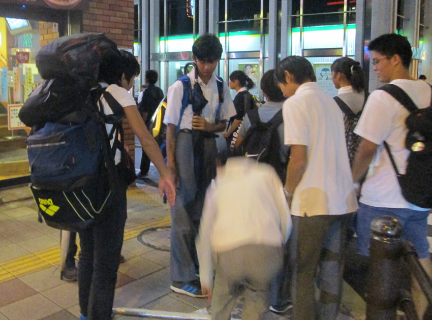 中学生がバッグを4つ5つ担いでいる。