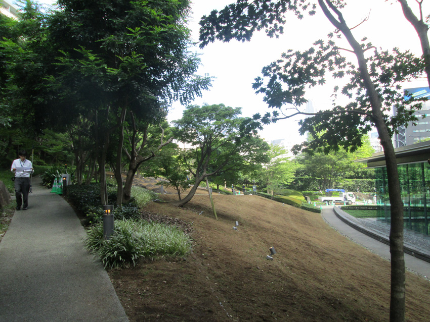 散歩コースの第一京浜沿いに超高層ビルがあり、その裏手の斜面が芝桜が植わっており、とても美しかった。