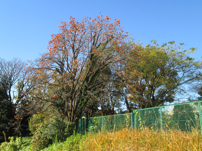 散歩の途中のの崖に大きな柿の木が、ことしも実がたわわに実っている。