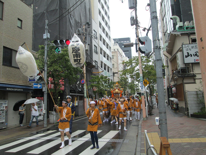 小雨の中の神輿担...
