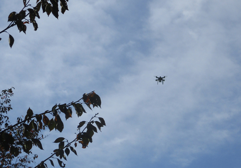 早足散歩をする公園で若夫婦がドローンを飛ばそうとしていた